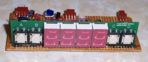 This is the control board for the device. It uses a PIC18F242 microcontroller to run the show. This PIC has a built-in ADC on it and I use this for reading the temperature of the two sensors. The board that the LEDs and buttons are on came from an old PCB I found. it just happened to be exactly what I needed :-) It also significantly simplified things since I didn't have to multiplex the LEDs and mount them and such.