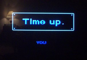 Once your time runs out (10 minutes per coin, or 20 minutes per coin, dipswitch selectable), the entire screen starts to flash bright/dim/bright/dim, and the unit feeps about once a second. This continues for 1 minute, giving you time to put more money in if you wish to continue playing. If you don't, then this screen appears. The text line says "SEE" YOU" "NEXT". yes, that's all it says. Then it switches back to the title screen.